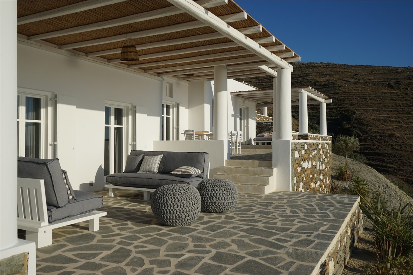 It consists of the main house and the guest house. It is worth mentioning the specially - designed roof of the main house, which is equipped with cushions that can be used to enjoy the spectacular view with the incredible sunsets.